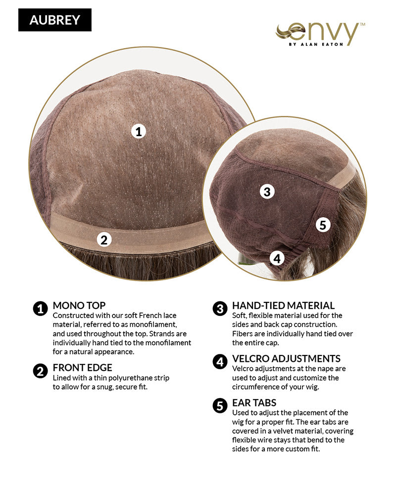 Aubrey is constructed with mono top and Hand-Tied Sides and back. With our Hand-Tied features through-out, you never need worry that anyone will know that you have anything but fabulous hair!