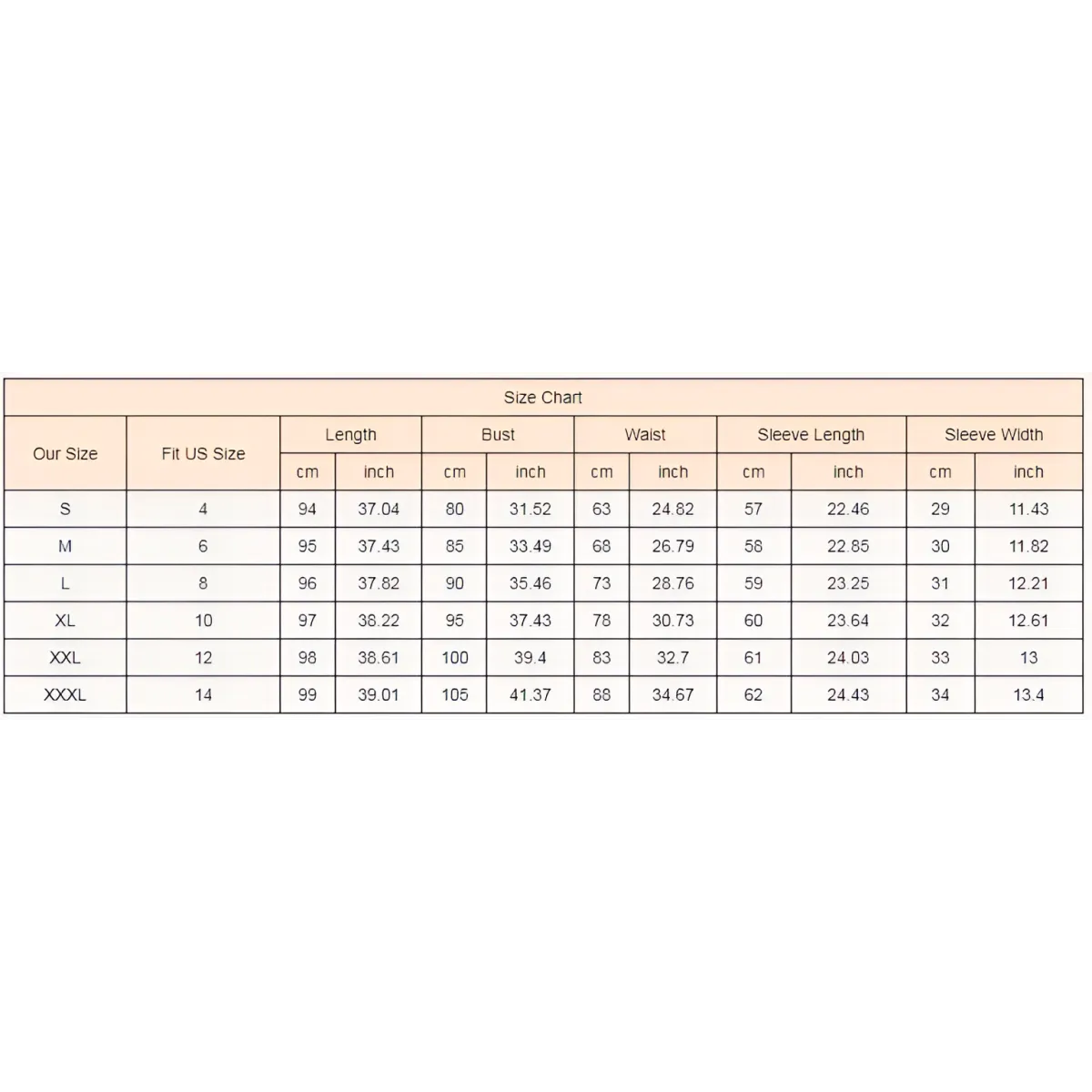| Our Size | Fit US Size | Length | Bust | Waist | Sleeve Length | Sleeve Width | |||||
