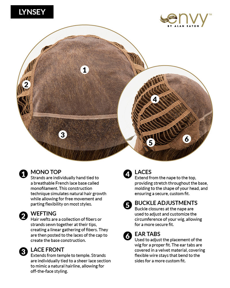 Lynsey is constructed with mono top, lace front and Hand-Tied Sides and back. Wear it straight or use your favorite curling technique to create your desired look.
