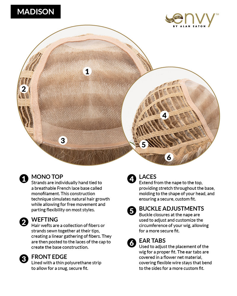 Madison by Envy offers cutting edge styling with these face framing layers that are razored at the edges to create a soft natural appearance. Mono top construction allows the wearer to feel confident that they have the most believable product available today. Lightweight, natural and tapering layers is the signature to this silhouette.