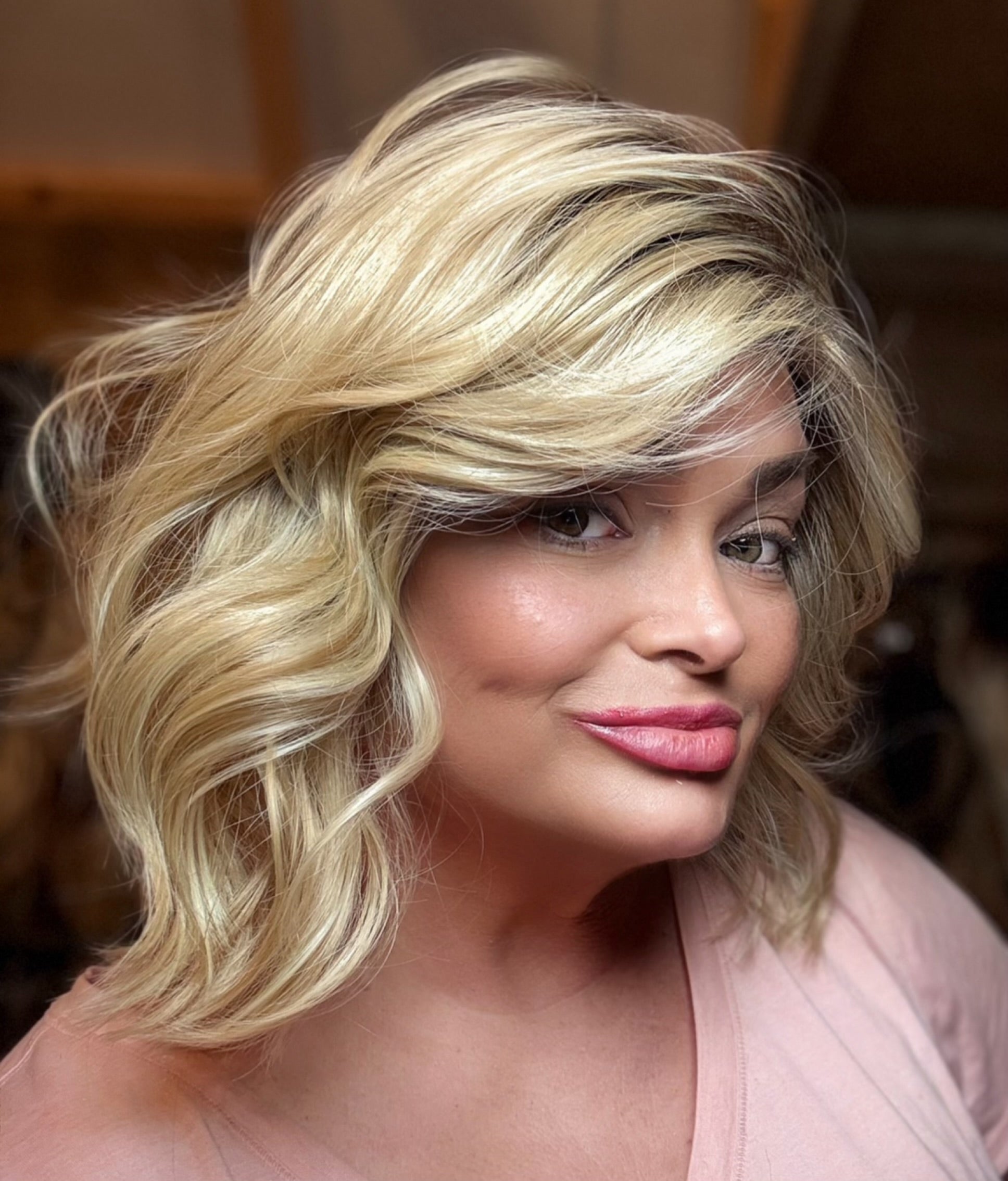 Introducing MARTA, the epitome of luxury with a full monofilament lace front and premium heat resistant Futura synthetic fiber blend. The 12" loose curls with layers and stunning neutral-warm blonde color, complete with rooting, offer a natural and effortless look. The adjustable velcro straps and open wefted design ensure a comfortable and secure fit for all cap sizes.
