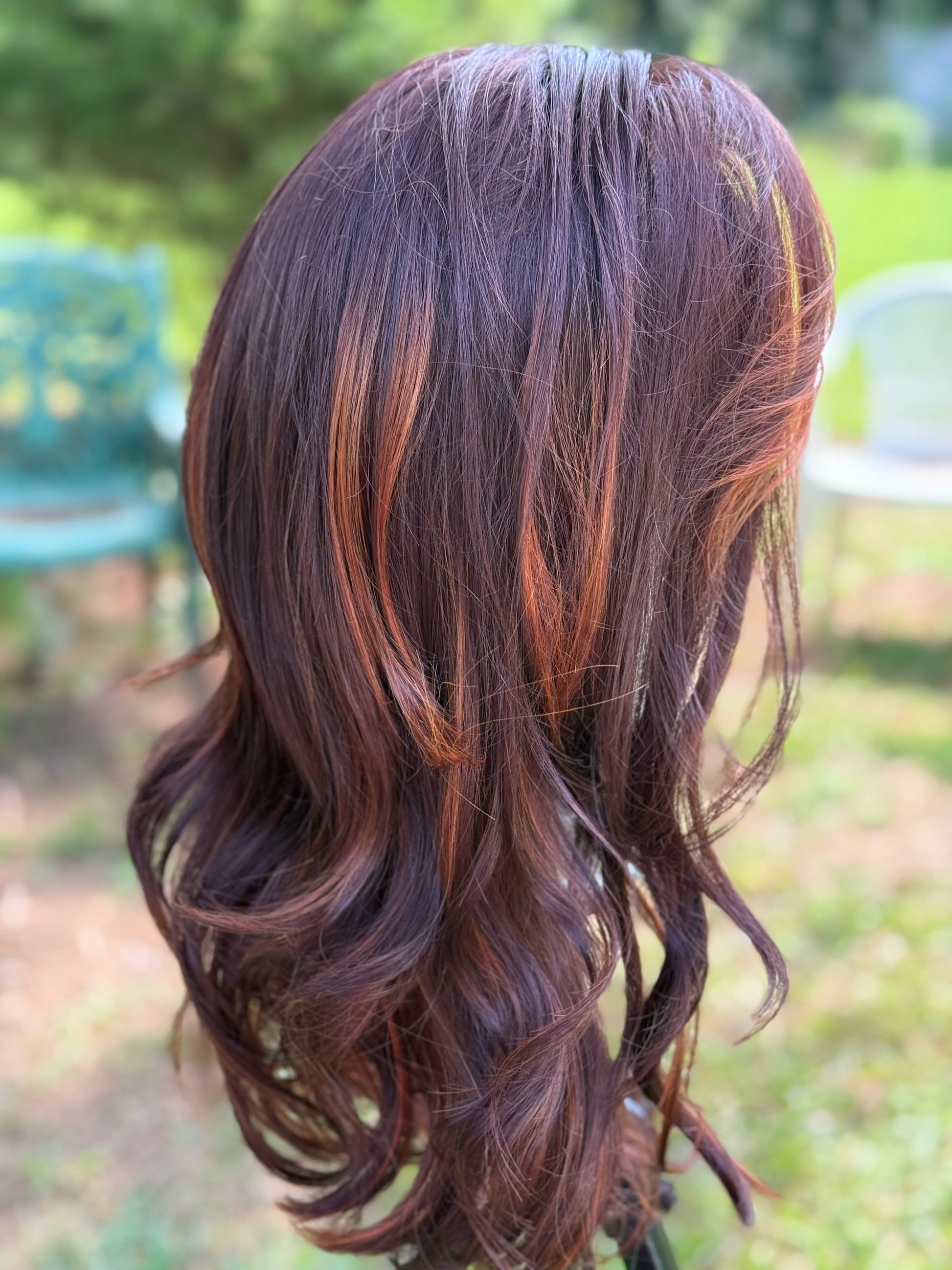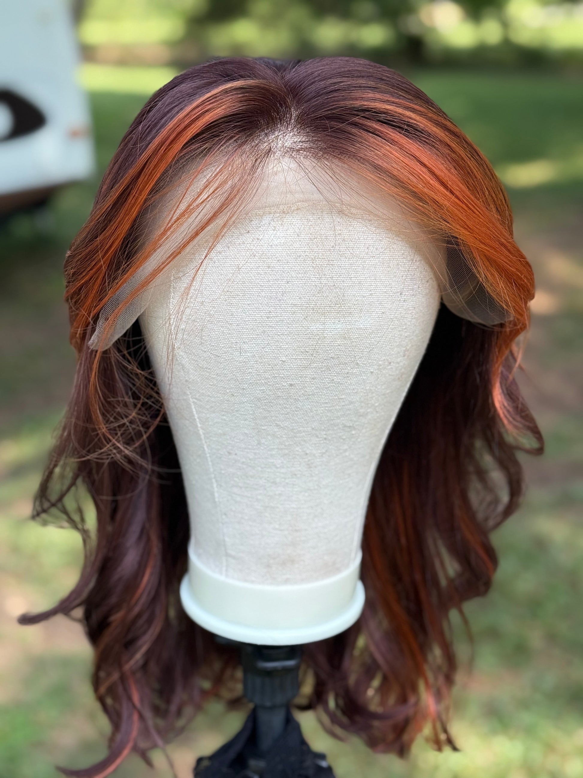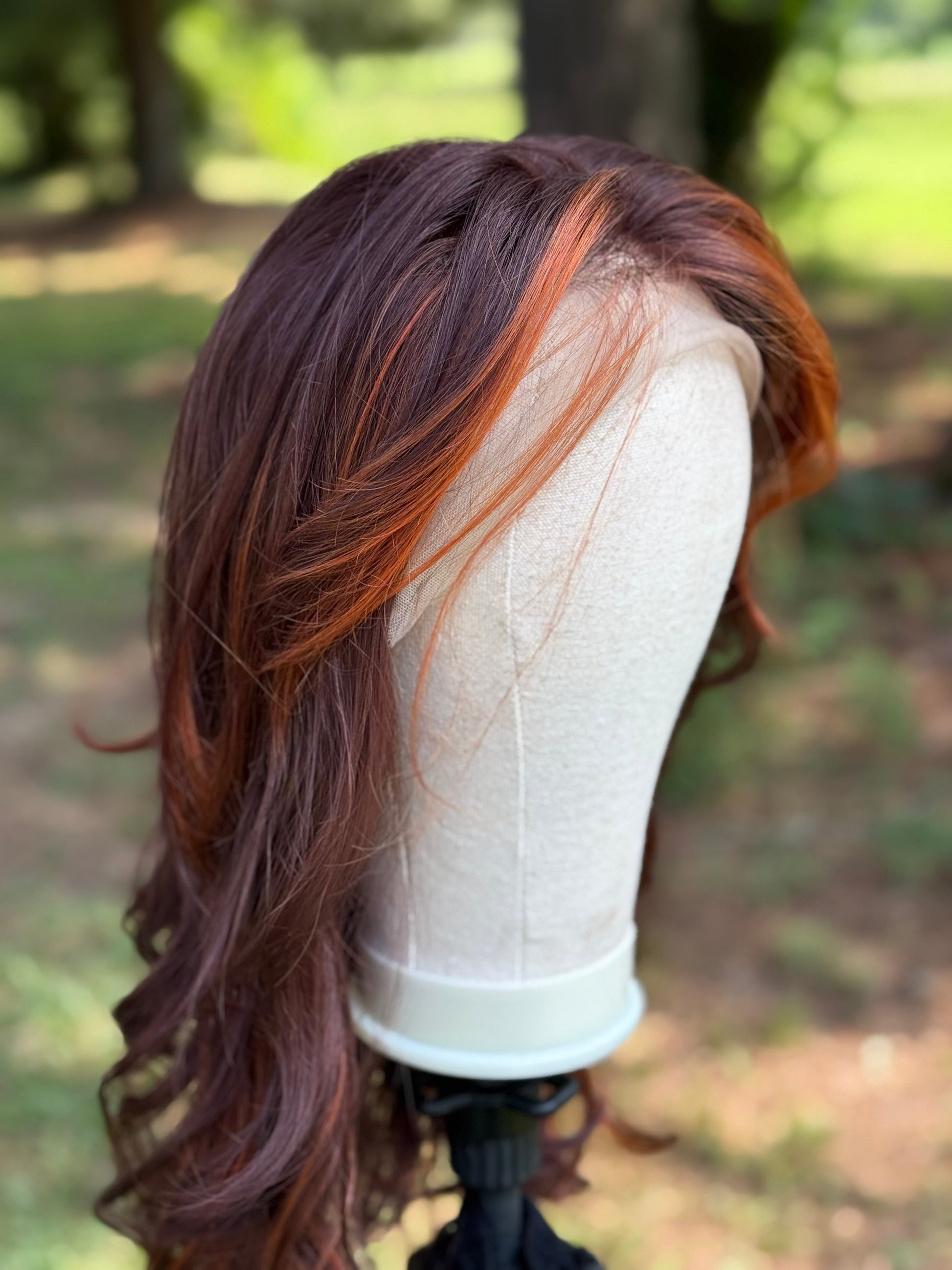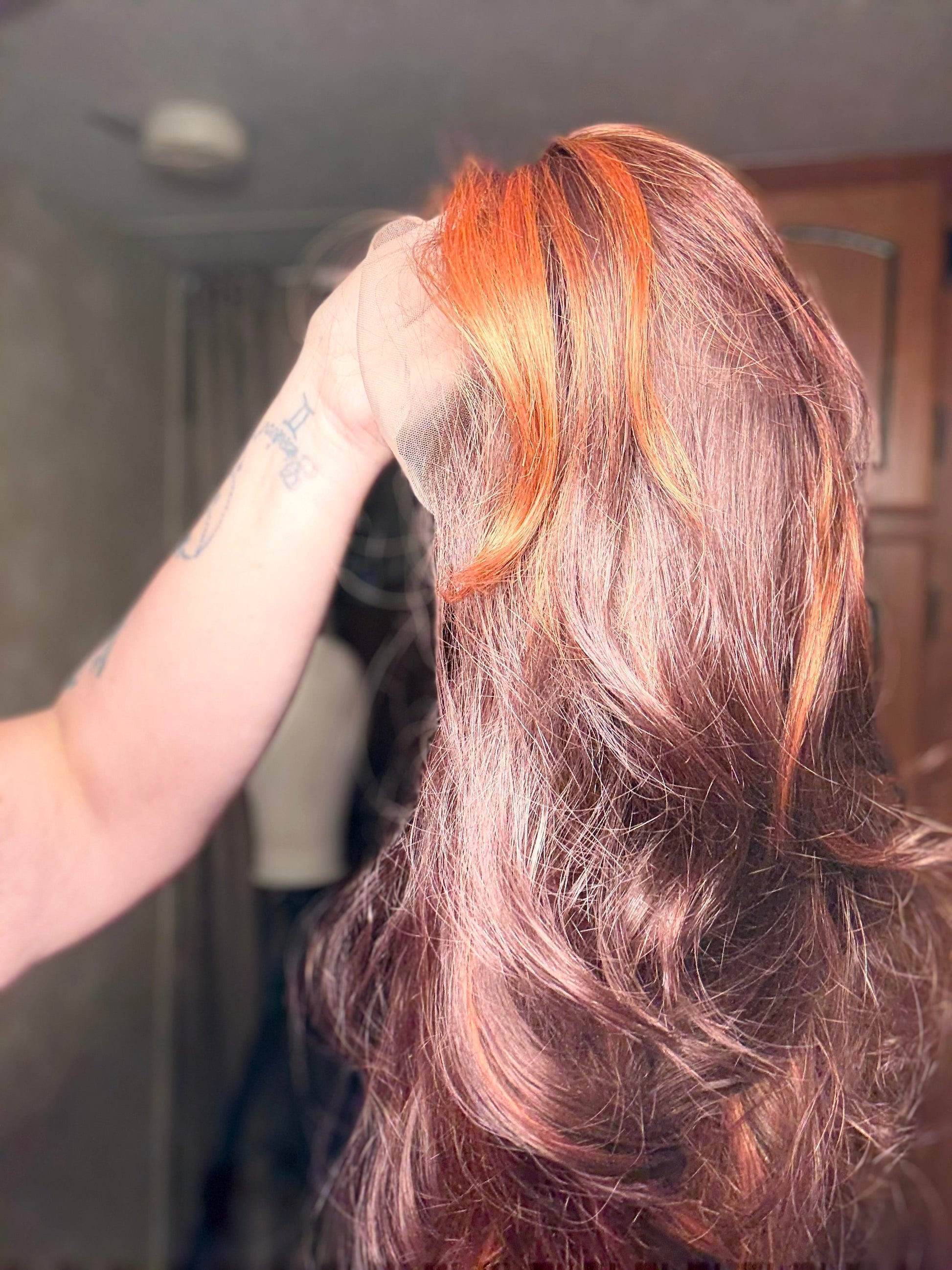 Experience the OZZY 13X4 Luxe Lace Front wig, crafted with premium heat-resistant Futura synthetic fibers for durability and styling versatility. Featuring a free part and customizable 22-24" loose curls with curtain bangs and layering, this low-density wig offers a natural look. Its stunning dark brown base is enhanced with copper and orange money pieces plus subtle highlights for dimension. Designed with adjustable straps, combs, and a standard cap size, BRAILEE ensures a secure, comfortable fit. Expertly customized by WBR for a flawless finish.