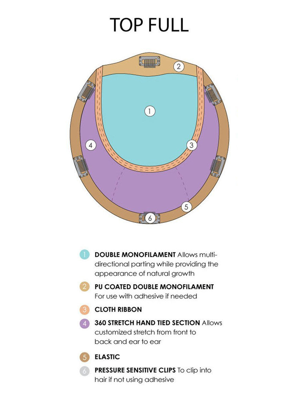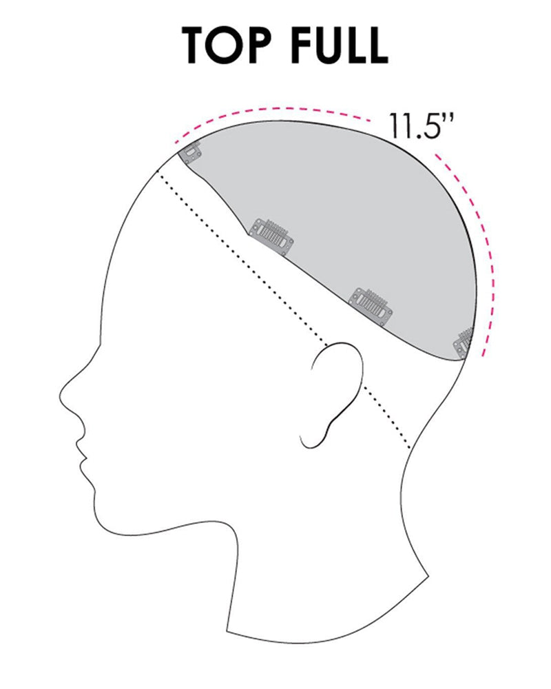 Designed with the comfort of a 100% hand tied stretch base, this mid-length Remy human hair volumizer is worn over the entire crown, providing the most coverage of any clip in topper.