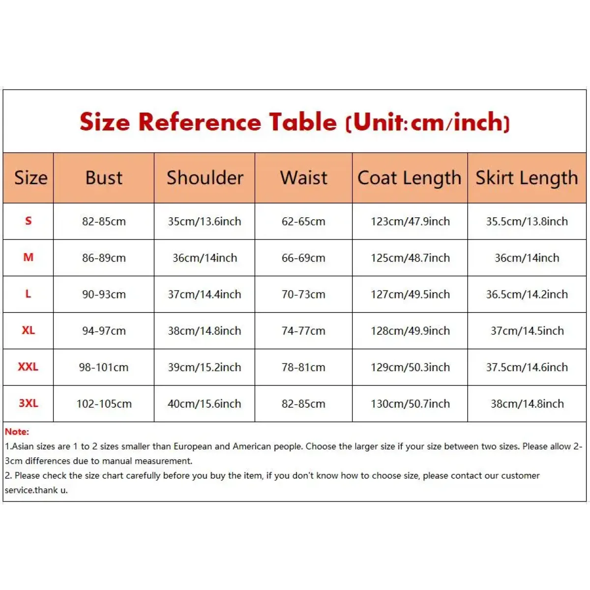 | Size | Coat Length (cm/inch) | Skirt Length (cm/inch) | Waist (cm/inch) |