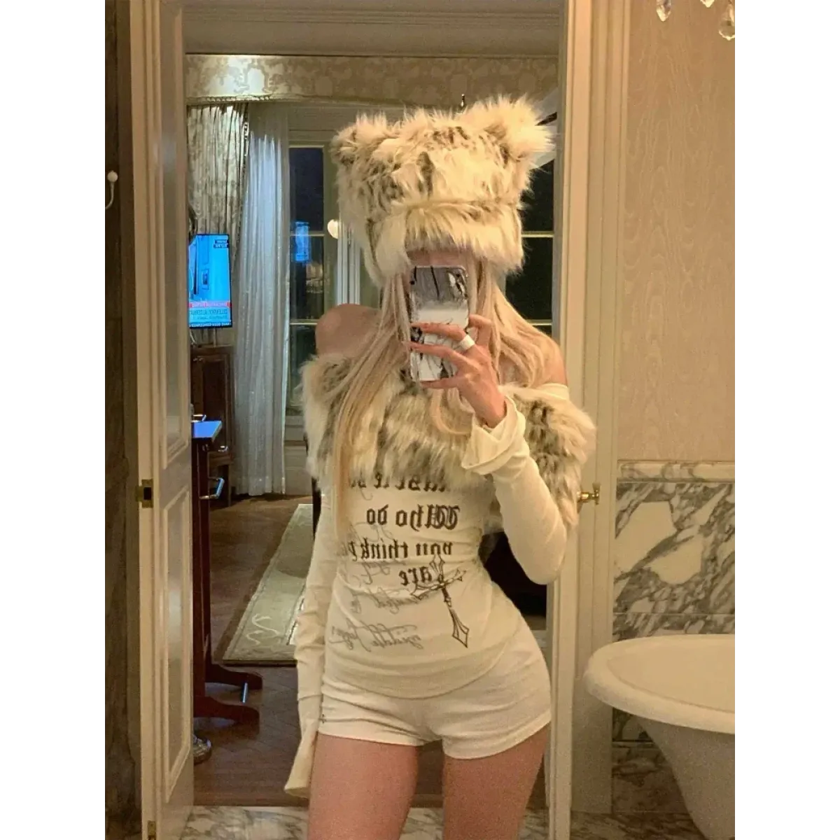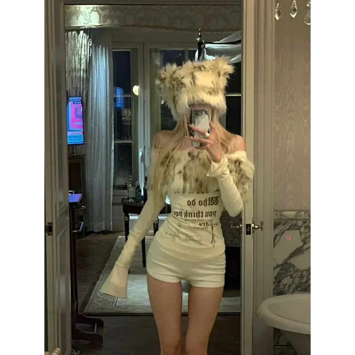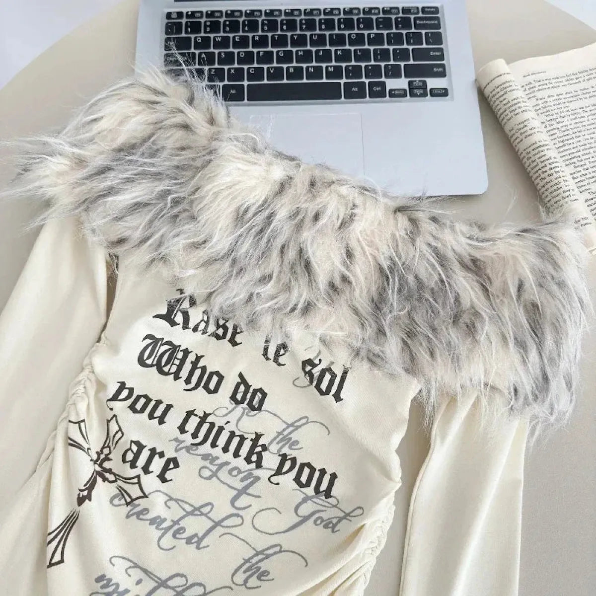 Y2K Coquette Off-Shoulder Top – Faux Fur Trim Long Sleeve