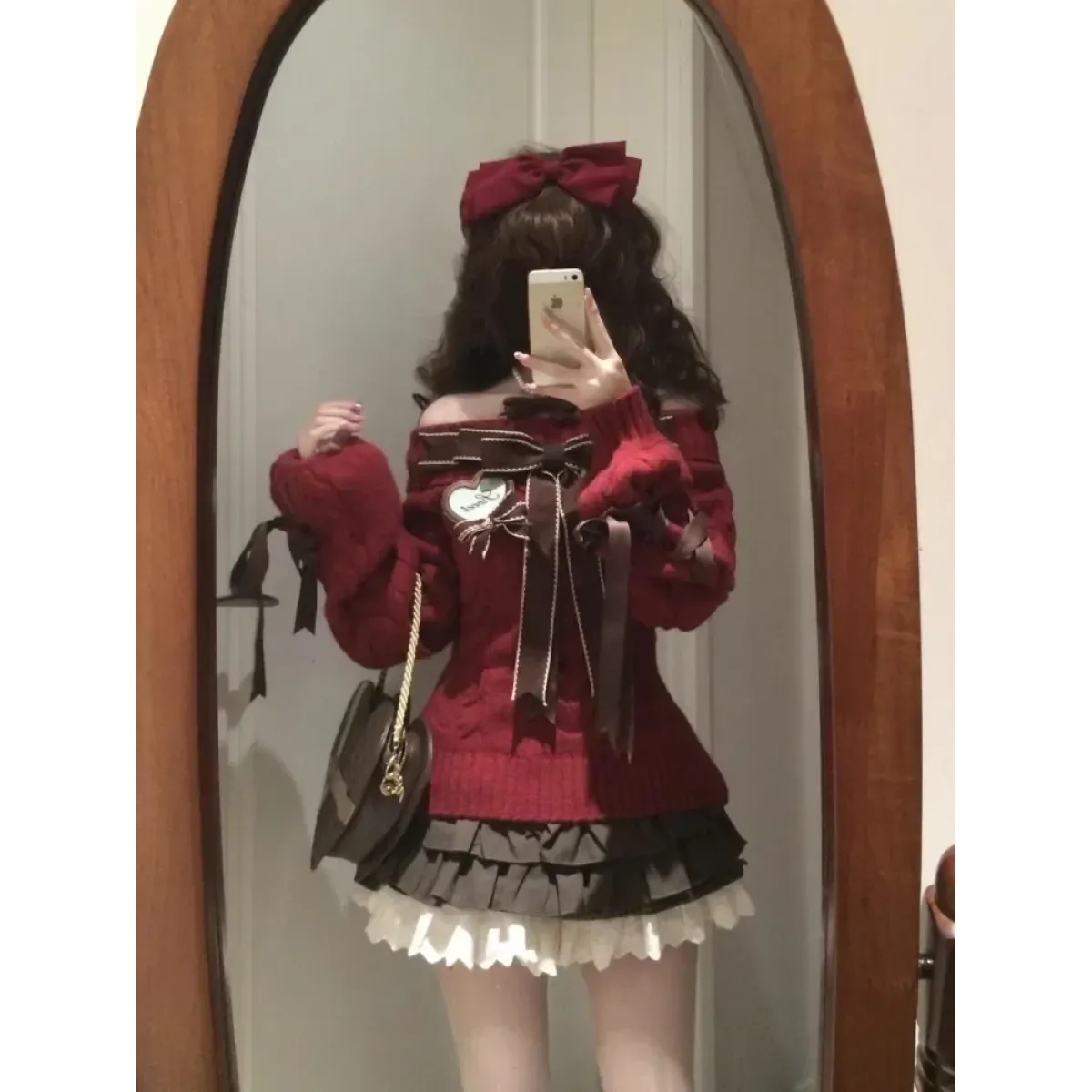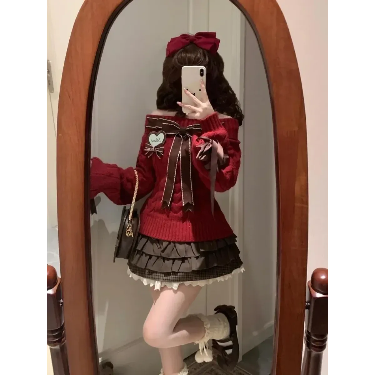 Y2K Off Shoulder Bow Sweater & Ruched Skirt Set – Autumn Knit