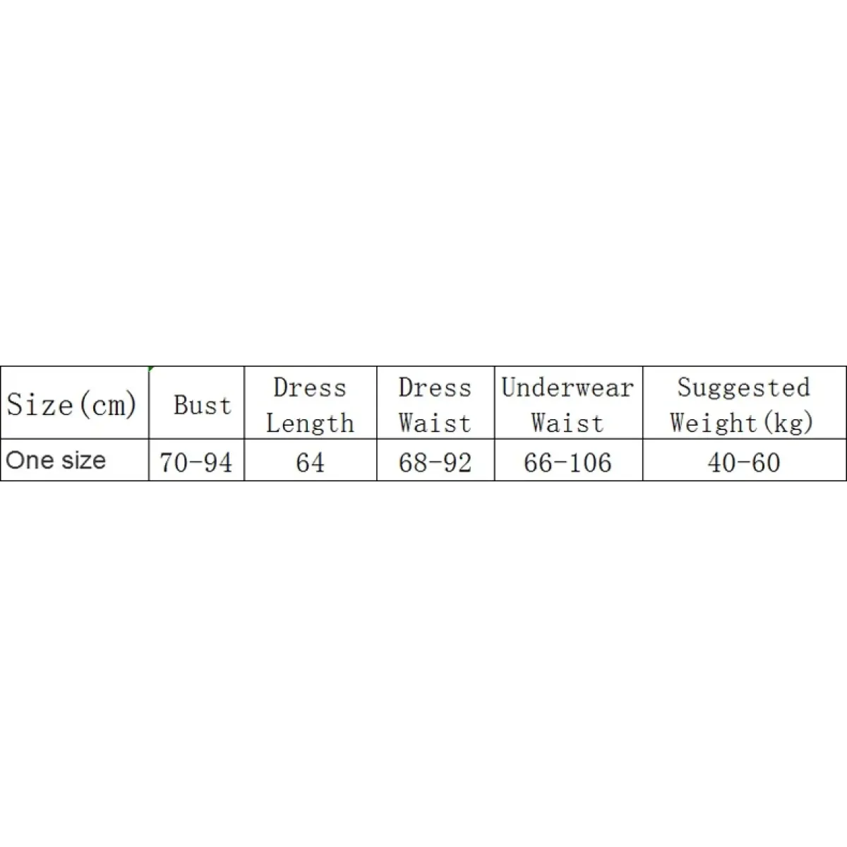 | Size (cm) | Dress Length (cm) | Dress Waist (cm) |