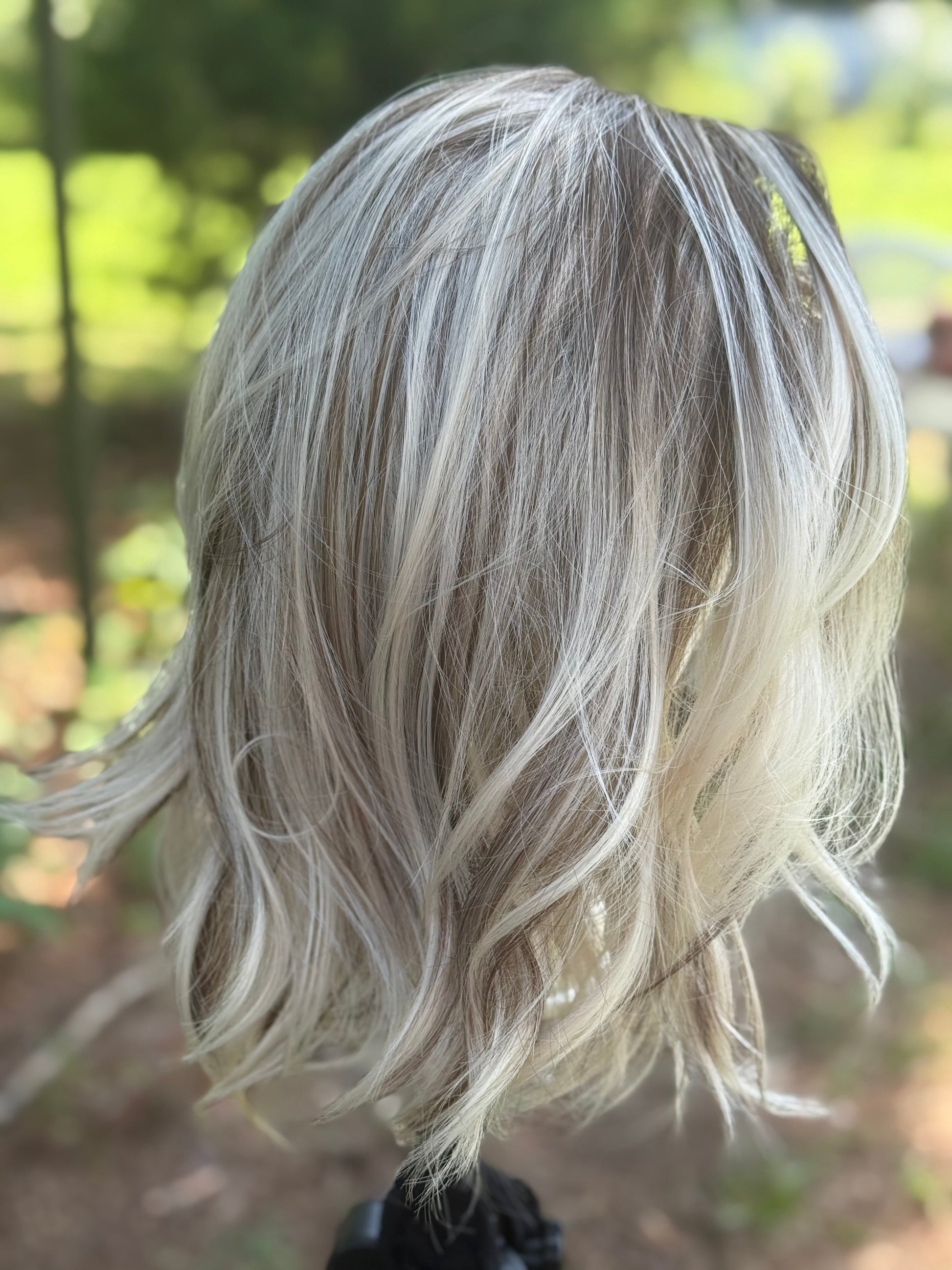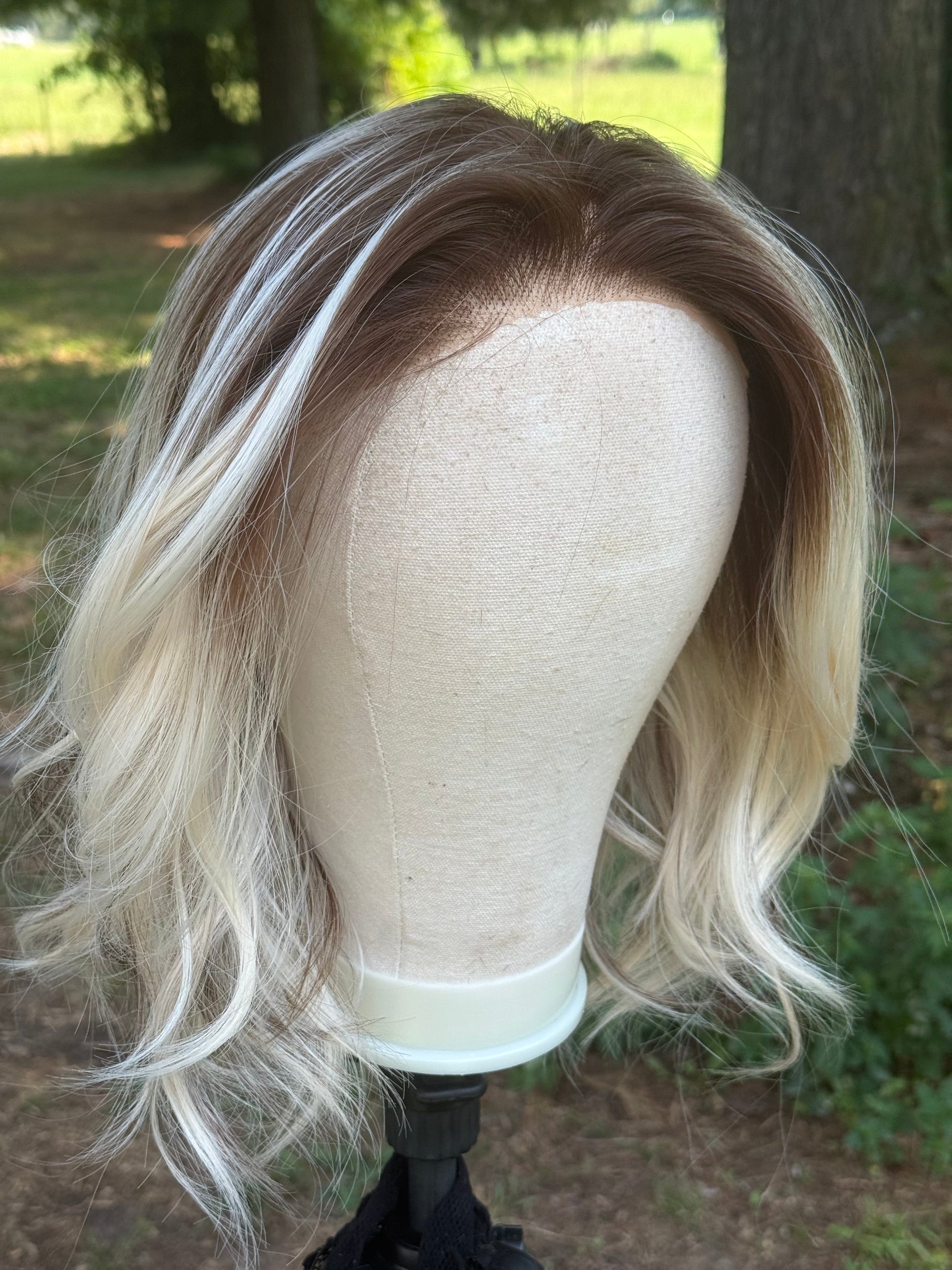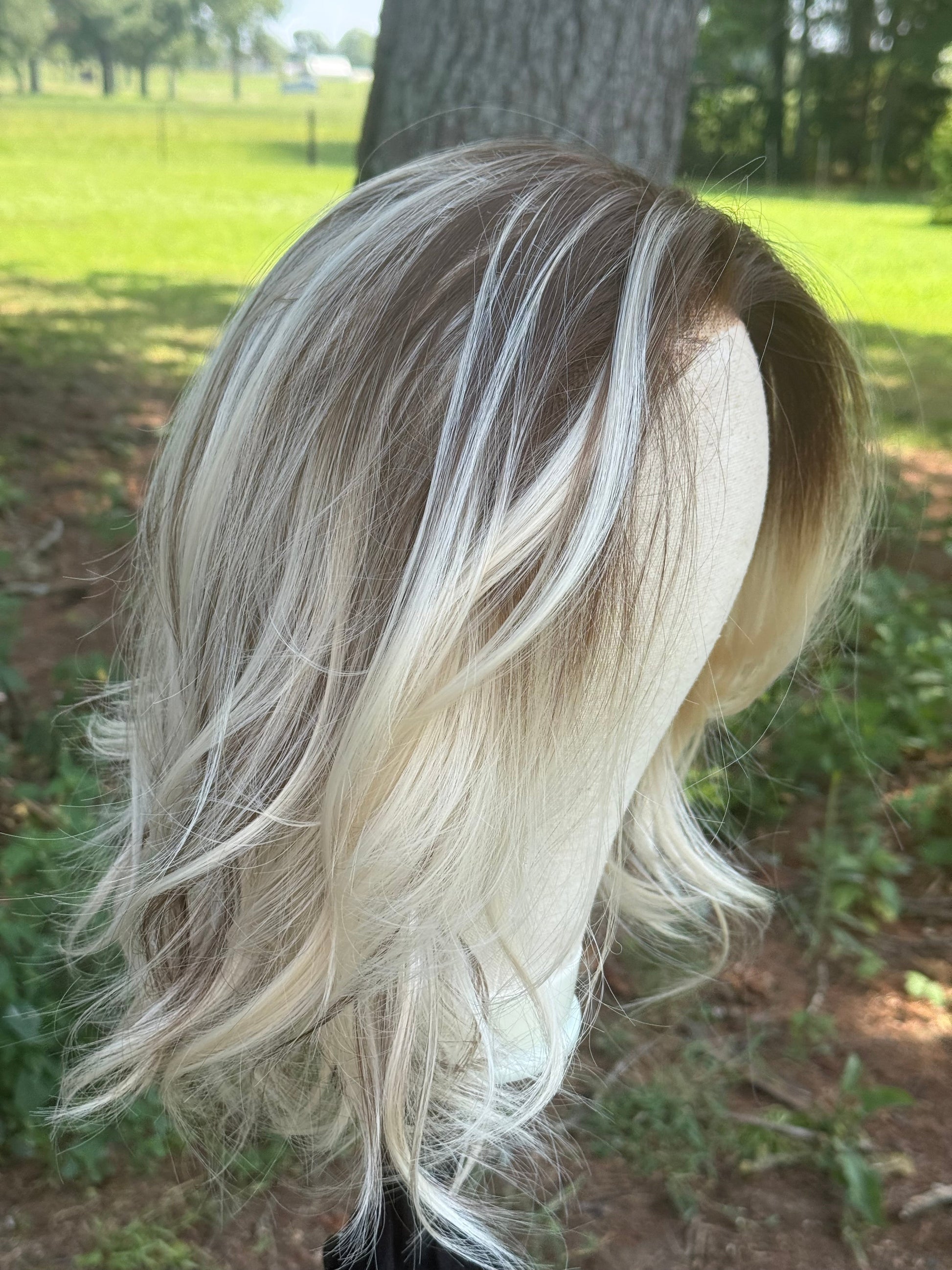 As an expert in the beauty industry, I present ANNABET - a 14 inch loose wave lace front with a free part and adjustable straps. The sterling blonde mix with low lights creates a cool and neutral tone for a custom WBR look. Pre-order now for ultimate hair customization.