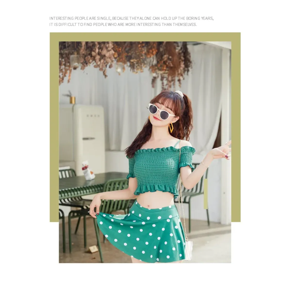 This adorable bikini set combines retro charm with modern flair! With a smocked ruffled crop top and a playful polka-dot high-waist skirt, it's your go-to look for beach lounging or poolside twirls.