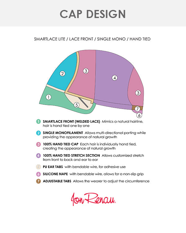 One of Jon Renau's most popular bobs gets an upgrade with the new SmartLace Lite cap. With lighter hair density and a unique lace front that extends from ear to ear for the most realistic hairline, Cameron Lite is a timeless style with elegant layers and refined length. Her mono top and 100% hand-tied cap provide the appearance of natural hair growth.