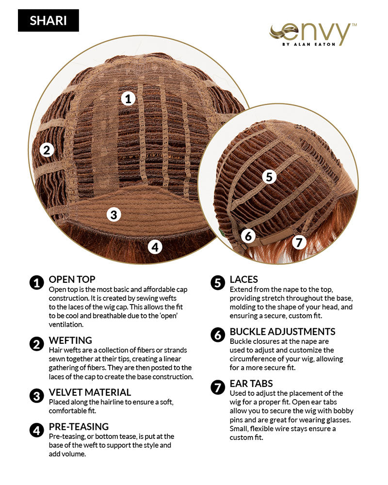 Shari by Envy is made in our capless Open Top construction. For the most breathable and lightweight construction available it is our Open Top Collection. Shari is trendy chic with long Sides swept bangs. The style can be pumped for more volume or worn more sleek and close to the head. Shari is now available in our Average Cap size for those looking for additional freedom of fit.