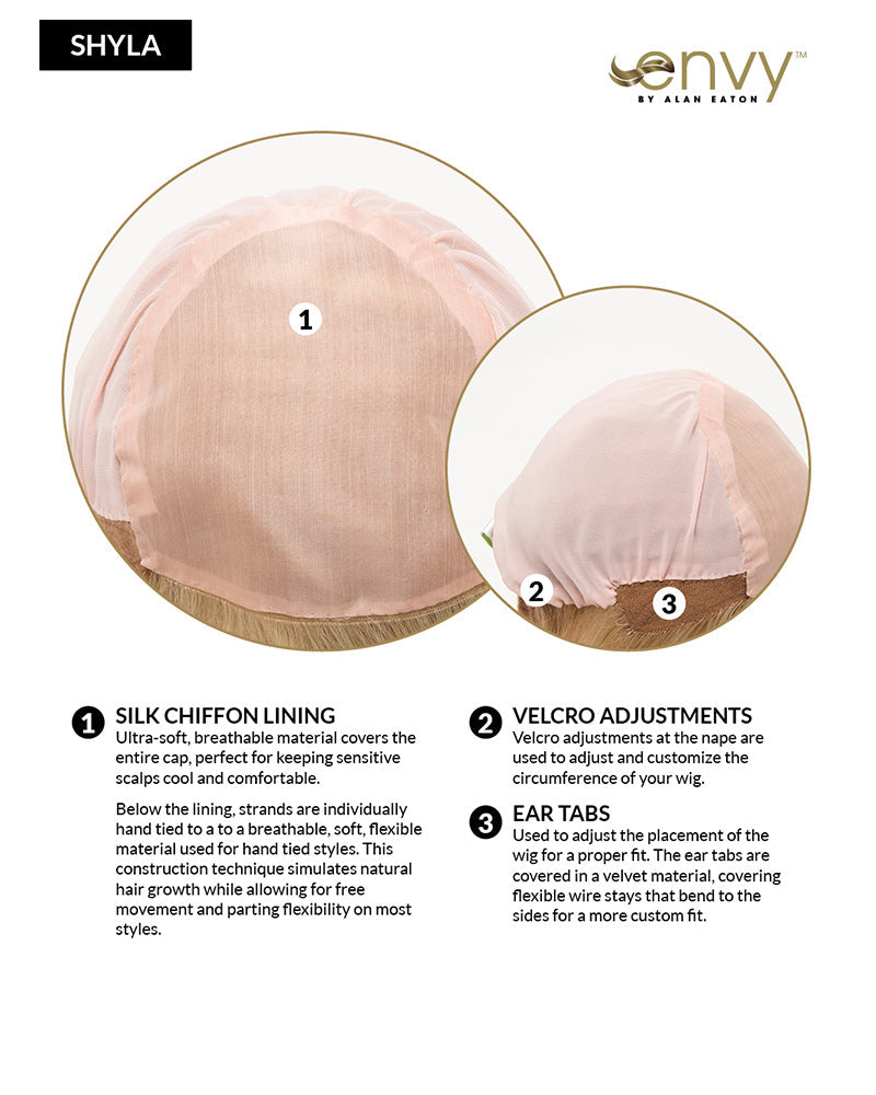 Shyla by Envy takes the most recent in technology combining our ultra soft silk chiffon lining cap construction with our trademarked Envyhair exclusive fiber made of 30% human hair and 70% heat friendly synthetic. Soft, comfortable and 100% hand-tied styling makes Shyla in a league all its own.